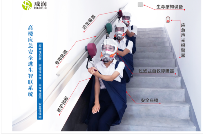 “高樓應急安全逃生智聯系統”項目,可有效解決高層建筑及各類人員密集場所內涉險人員的群體性緊急疏散難題, 在傳統“防、消、救”的層面上,增加了“逃”的功能。當發生火災等緊急情況時,第一時間實現聯動報警,百米高層3分鐘快速逃生,高效有序撤離至地面安全地帶。同時結合物聯網+功能,對樓內人員進行生命探測、位置追蹤,為消防隊員提供精準救援信息,將主動自救互救和協同組織救援緊密結合,有效提高救援全過程質效,降低人員密集場所群死群傷重特大火災事故的發生幾率,扭轉重特大事故多發被動局面,減少人員傷亡及財產損失,全方面保障人民生命財產安全,填補人員密集場所緊急疏散基礎設施建設空白。