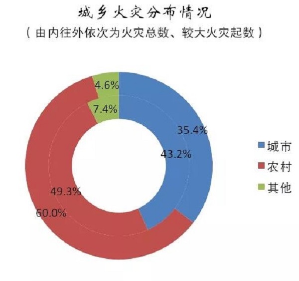 從城鄉(xiāng)火災(zāi)的分布看,全年農(nóng)村地區(qū)共發(fā)生火災(zāi)12.4萬(wàn)起,占總起數(shù)的49.3%,比城鎮(zhèn)高出6.1個(gè)百分點(diǎn),造成損失19.2億元,占總損失的48.1%,比城鎮(zhèn)高出12.2個(gè)百分點(diǎn),火災(zāi)基數(shù)仍然較大;特別是農(nóng)村地區(qū)共發(fā)生較大火災(zāi)39起,占總數(shù)的60%,比城鎮(zhèn)高出近七成。