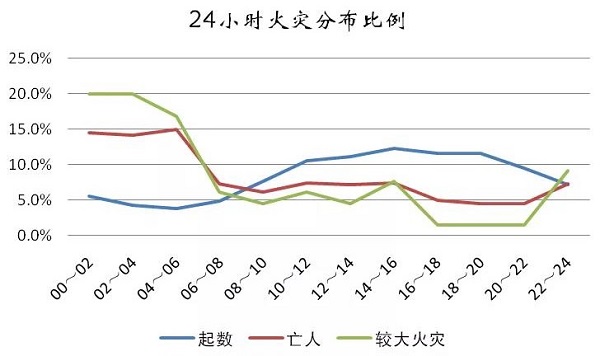 從火災(zāi)的時(shí)段分布看,夜間是全天火災(zāi)低谷,但由于發(fā)現(xiàn)晚、報(bào)警晚、處置晚,往往易造成傷亡,尤其0時(shí)至6時(shí)的火災(zāi),只占全天的13.7%,但亡人數(shù)占43.6%,較大火災(zāi)數(shù)則占56.9%。